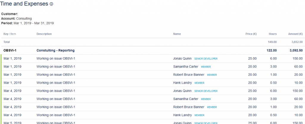 Pohľad na nákladové stredisko – koľko času bolo vykázané jednotlivcom v tímovej role + prepočet na základe sadzby – podklad pre fakturáciu.